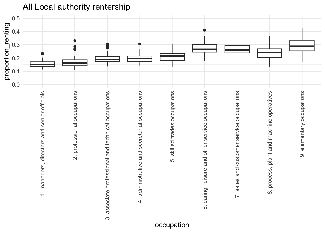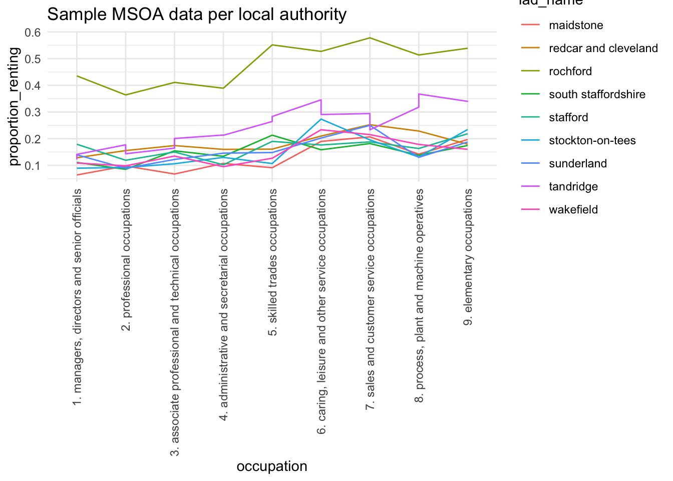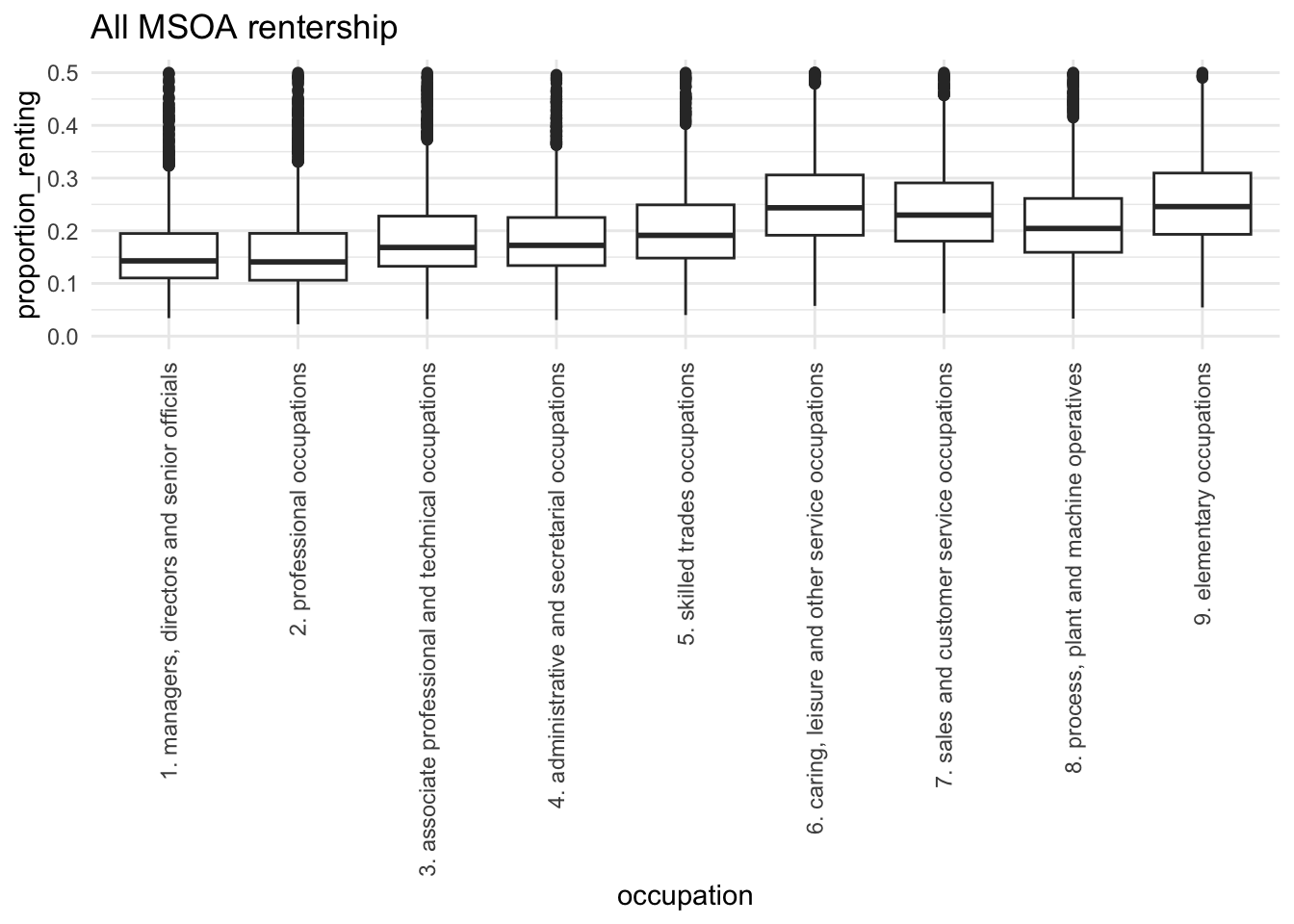 Cross tabulated MSOA level data on Tenure by Occupation, from ONS 2021 Census can be found from Nomisweb API (“RM140: Tenure by Occupation - Household Reference Persons” 2023)